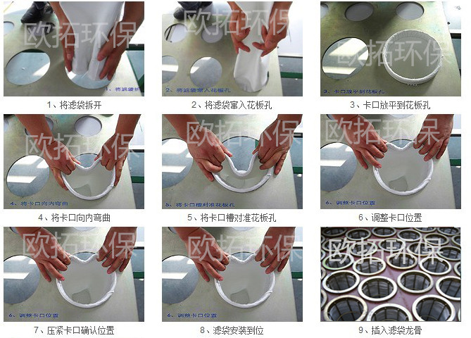 正確的 安裝除塵器布袋 ,不僅可以 避免除塵器布袋 的機械損傷,還可以延 長除塵器布袋 的使用壽命。在安裝除塵器布袋之前要注意,存放時要注意除塵器布袋遠離火源,要防潮,避免陽光等強光直射,防止重要擠壓。安裝前需要對每一條布袋進行檢查,防止機械損傷。除塵布袋的安裝應當在除塵器全部安裝工作完成后進行。先拆除噴吹管再安裝除塵布袋。布袋的搬運和存放時要注意防止除塵布袋與周圍硬物、尖角物件發生觸碰現象。禁止腳踩、重壓等,避免發生破損的現象。 首先把除塵布袋從包裝箱中取出后(須立即安裝到花板孔中,不可以預先把除塵布袋取出放置一旁)。裝置布袋的辦法是先將布袋由箱體花板孔中放入袋室,然后將袋口上部的彈簧圈捏成凹型,放入箱體的花孔板中,再使彈簧圈恢復,使其嚴密地壓緊在花孔圓周上,最后將袋籠從袋口悄悄插入,直到袋籠上部的護蓋的確壓在箱體內花板孔上為止。為避免布袋踩壞,請求每裝好一個布袋,就裝一個袋籠。如圖 :